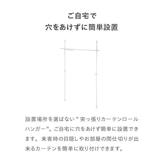 工具不要で簡単設置可能な突っ張りカーテンロールハンガー。カーテンリング付き。 カーテンは付属しておりません。