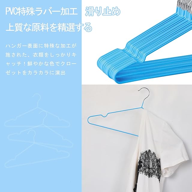 【耐久性】ステンレス鋼製+PVCコーティング。 ステンレスハンガーは通常のプラスチックのハンガーより耐久性が高く、長期間使っても壊れにくいメリットがあります。(耐荷重量は約3kgになります。) このハンガーを使用して収納すると一般的なハンガーを使用した際よりも50%程度省スペースになります。統一感もでて、クローゼットの中がすっきり気持ちよく整います。