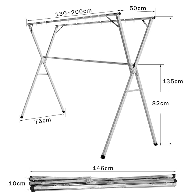 【拡張可能な物干しラック】幅130 ~ 200cm。高さ135cm。約4.3kg。収納時:(約)幅135cm。定評のある折りたたみ機構を備えているため、使わないときは折りたたんでどこにでも収納できます。女性やお年寄りでも簡単に使えます。