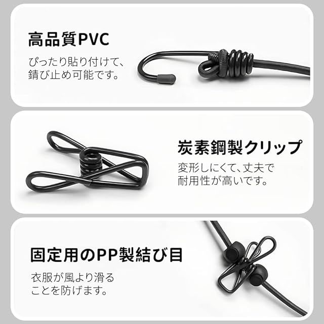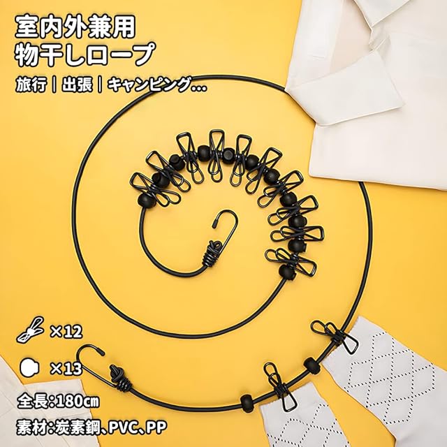 丈夫で長持ち設計 - 2つのステンレススチールエンドフックと12個の洗濯バサミで錆びません。 丈夫で伸縮性のあるラインは10フィートまで伸びます。
