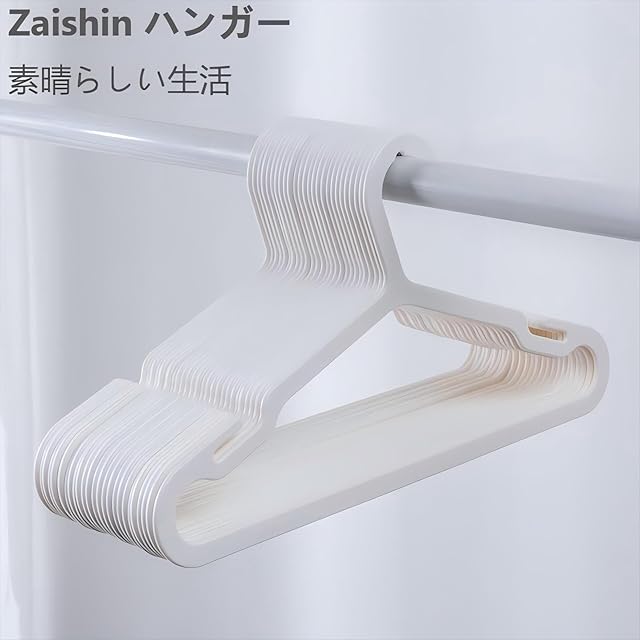 Zaishin ハンガーはポリスチレン製です ポリスチレン材質とはスチレンの付加重合によって得られる高分子化合物で、無色透明の熱可塑性樹脂です この材質の特徴は強い靭性です 折れと変形にくて堅固耐用です 厚さは0.3CMで省スペースと収納便利の効果があります 四季折々の衣服や乾湿衣服など干せます