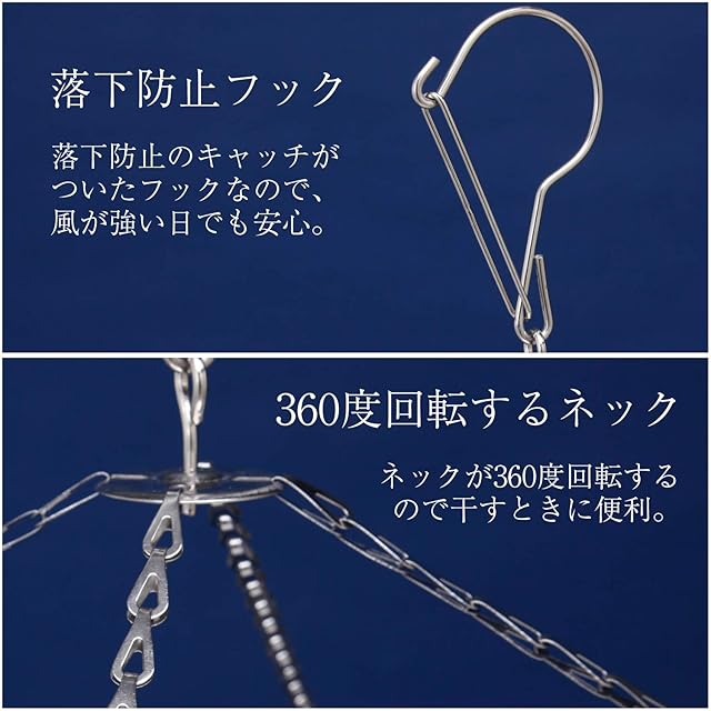 落下防止のキャッチがついたフックなので、風が強い日でも安心