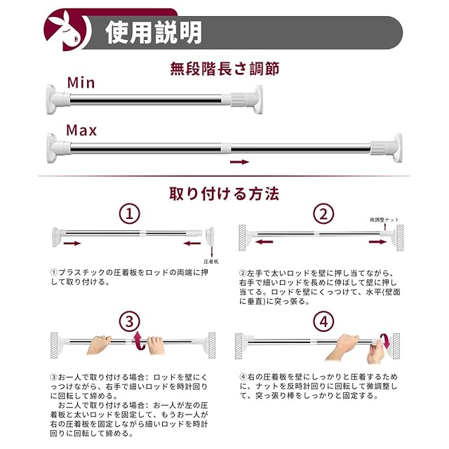 【簡単な取り付け】くぎ・ネジ ・パンチ等の工具を使わず、微調整ナットだけで簡単に取り付けられます。壁に穴がある心配もなく、壁に痕跡も残さないので、つっぱり棒を安心に取り付けて、賃貸住宅におすすめです。