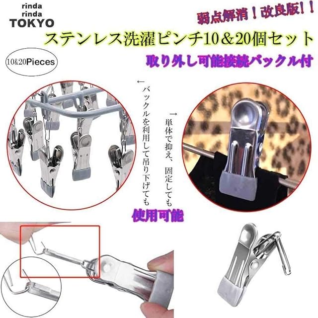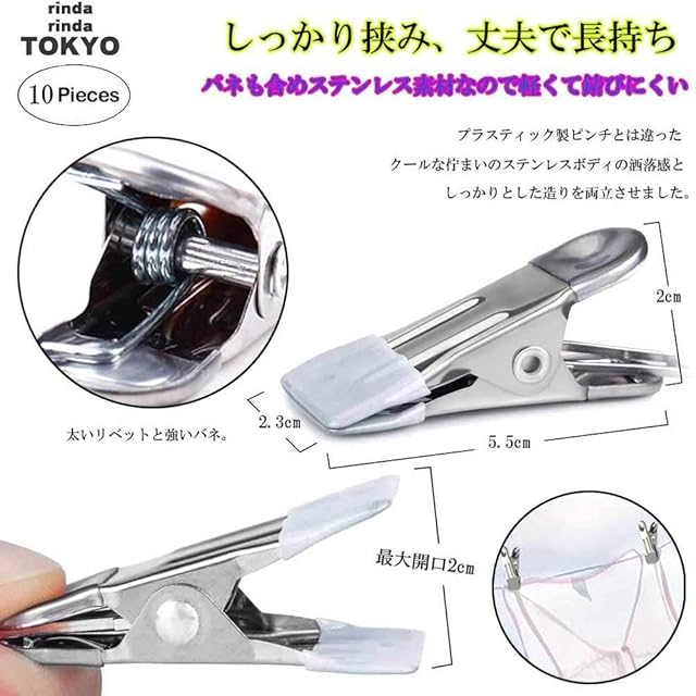 rinda 洗濯ばさみ 洗濯バサミ ステンレス 10個 滑り防止 跡が付きにくい ラバー付 吊り下げバックル付 ピンチ ハンガー 落ちない ズレない ノンスリップ