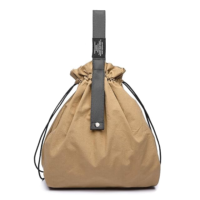 ①綿麻素材を使用し綿の持つ柔らかさと麻のもつ独特のシャリ感が特徴です。 ②色もアースカラーでナチュラルテイストに仕上げました。 ③コンビニやちょっとしたお買い物の時に便利なサイズになっています。④巾着型なのでコンビニ弁当を入れても傾きにくくなっています。 ⑤普段使いしてもかわいいデザインになっています。