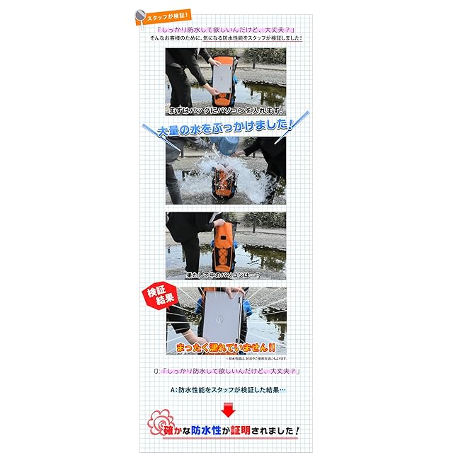 ●すごいのは防水、容量だけじゃない! ・ロゴ部分は反射プリントを採用。光を反射するので夜間でも安心。 ・衝撃を吸収する緩衝材入りの肉厚ベルト。長時間荷物を持ち歩いても肩を痛めません。通気性がよく、乾きやすい素材です。 ・携帯ライト、折り畳み傘、鍵などを付けられるDリング。 ・体との一体感を高め、疲労を緩和します。高さ、長さの調節も可能。どんな体型にもフィットします。 ・背面にあたる部分には通気性の良いメッシュ生地を使用。 ・肩甲骨や腰など体に密着する部分もメッシュ生地を使用。メッシュ部分は厚手のクッションなので背中にもしっかりフィット。長い時間背負っていても快適。 ・ショルダー部分も体に当たる面は同一素材になっており、長時間の使用にも安心のデザイン。大きな織り目で乾きも早いです。 ・500mlのペットボトルも入るメッシュポケットが両サイドに。飲み物などこまめに使う物を入れておけば、バックを開けずに取り出せて便利。