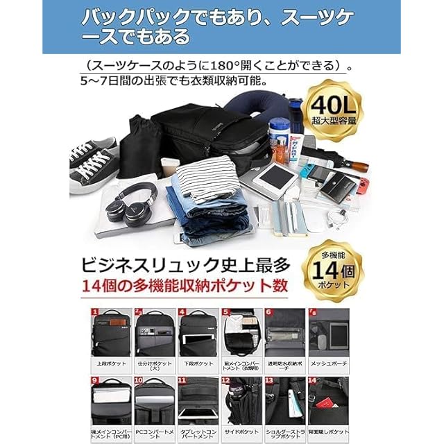 超大容量 ビジネス 旅行 リュック:外寸55x34x20cm(21.6x13.3x7.9インチ)で、機内に持ち込み可能です。15.6-17インチのラップトップのほかに、旅行の時も3~5日分の服も収納できます。