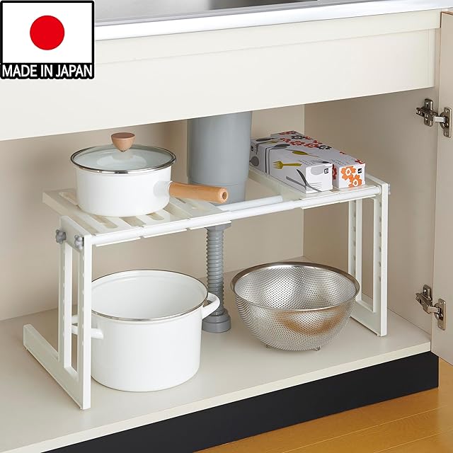 シンク下のサイズに合わせて幅50~75cmの間で伸縮することができ、棚の高さも3cm間隔でスペースに合わせて調節できます。