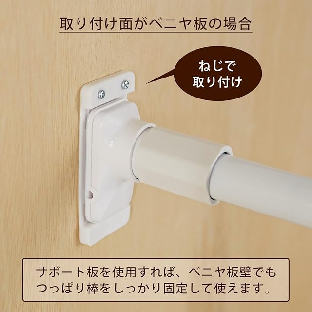 壁面強度の弱い石こうボードやベニヤ板にも突ぱり棒を取り付けできるサポート板。ずれ落ちず、耐荷重もアップするのでつっぱり棒を強力に設置可能。※硬質石膏ボードや5.5mm厚未満のベニヤ板には使用しないでください。