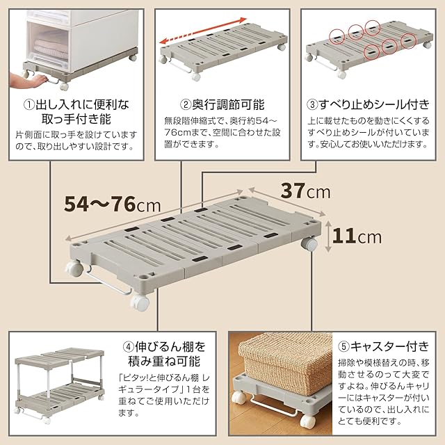 天馬(Tenma) クローゼットや押入れの収納物の出し入れが簡単にできるキャリー 伸びるんキャリー 奥行の調整可能で通気性も考慮した形状で湿気対策もばっちり 整理棚 棚 【色 ベージュ】【型番 キャリー】【幅37×奥行54-76×高さ11cm】 | HiKaRiストア