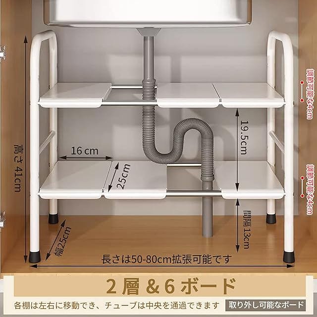 【幅広い伸縮収納ラック】サイズ: (幅50~80×奥行25×高さ41cm)、水槽下の微妙なスペースに完全フィット!50-80cm の伸縮幅調節可能で、上下2種類の高さ調整が可能で、シンク下の不規則なスペースでもスムーズに設置。洗面台下やキッチンシンク下など、あらゆる収納ニーズに対応します。