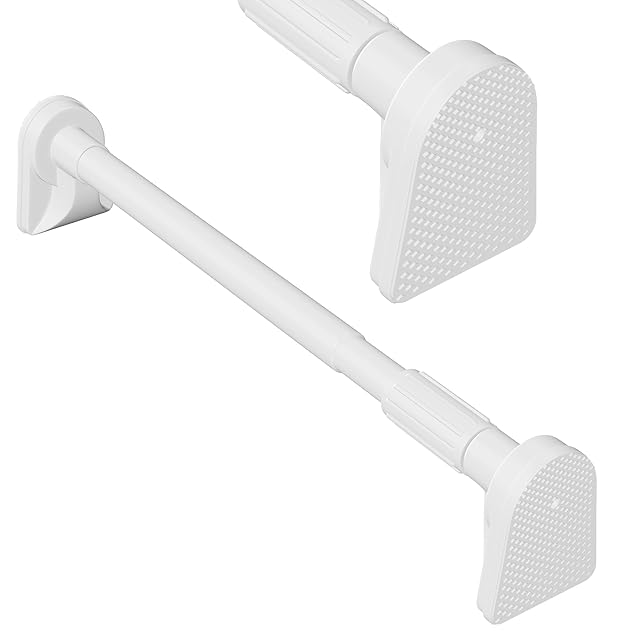 【簡単な取り付け】圧着板の壁に接する部分はゴムっぽい素材になっており、壁にぴったりします, 両サイドにダイヤモンド格子の凸凹がデザインされた摩擦力の高いシリコーンヘッドが採用され、伸縮パイプを任意の長さに調節し回してロック、片側の回転式グリップを回すことで突っ張り固定できる仕様です。 くぎ ネジ パンチ等の工具を使わず、微調整ナットだけで簡単に取り付けられます。壁に穴がある心配もなく、壁に痕跡も残さないので、つっぱり棒を安心に取り付けて、