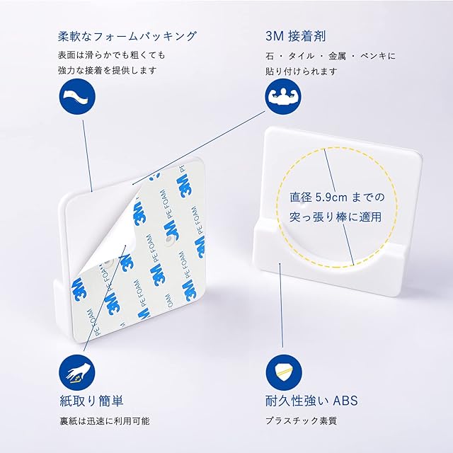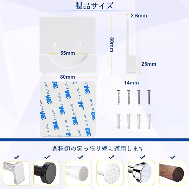 【仕様】サイズは8×8×1.4cm、半円形溝の直径は5.9cmで、直径は5.5cmまでにの突っ張り棒を支えられます、厚さは1.4cm、材質はABS、固定板×2、両面テープ×2、ステンレススクリュー×4、拡張ゴムプラグ×4