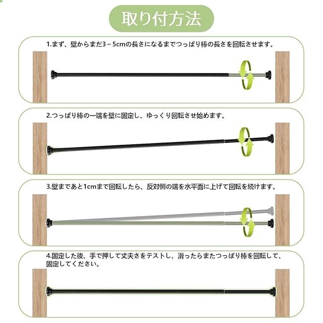 【調節可能・広く使われる】スプリング内蔵で、65-100cmの長さが調節可能で、室内クロゼットロッド、カーテンロッド用、浴室タオル掛け用、シャワーカーテン用、DIY棚、部屋干し用、洗濯干し、布団干し、物干し竿、キッチン用品収納など様々なシーンで活用できます。簡単に取り外せるので、屋内でも屋外でも使えます。