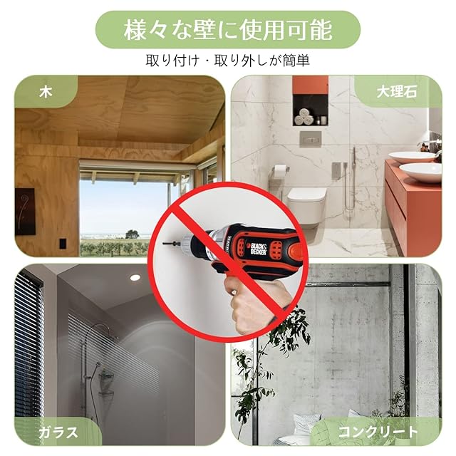 【痕跡なし・ドリル不要】接触面の一端を壁に当て、もう一方の接触面をしっかり押し付けて、完全に動かなくなるまで回転させて壁に固定すれば、取り付けは完了です。 釘やネジを使う必要がなく、取付時に壁に穴を開ける必要もないので、壁に痕跡を残さず簡単に物を掛けることができます。