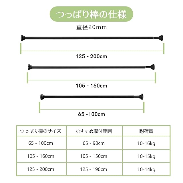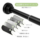 【塗装したステンレス】304ステンレス、ABSプラスチック、滑り止めゴムと鉄で構成されたつっぱり棒です。 ステンレスは黒色塗装が施されており、見た目だけでなく、耐腐食性にも優れ、錆びることもありません。耐荷重は16kgで、日常生活で活躍できます(設置する長さによって異なり、短いほど耐荷重は高くなります)。