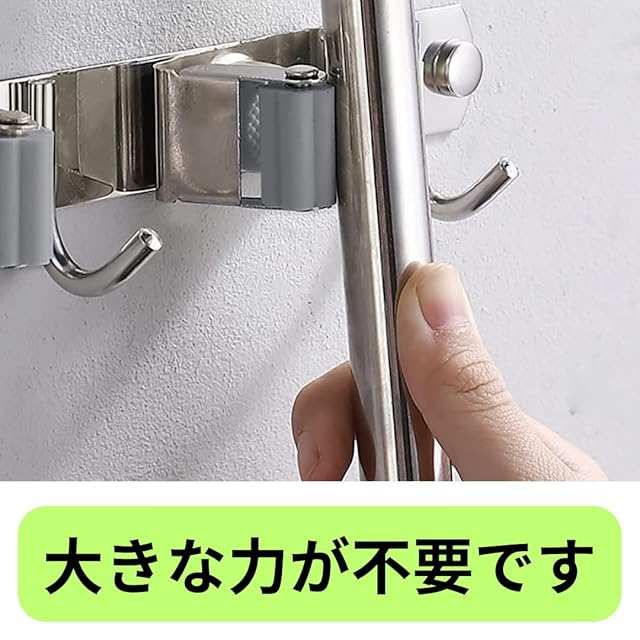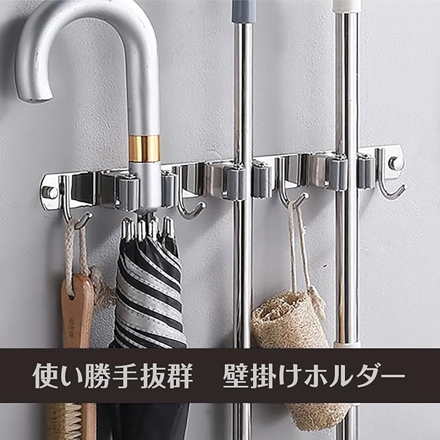【このモップホルダーの特徴】モップホルダーはスムーズな高級ローラーを使用し清掃器具などの脱着がスムーズに行えます。フックは高荷重にも耐えられる高級ステンレスフックを採用。使ってみれば違いわかるモップハンガー。【使い勝手の良い仕様の壁掛けハンガー】ほうきやモップ、水切りワイパー、調理具、清掃用品など安定固定できる優れもの。玄関やキッチンなど、場所を選ばずおしゃれなデザイン【安定した土台のモップハンガー】ネジ又は、両面テープ 壁掛け、ねじ取付、テープ取付方法が可能 ねじ取付は重量物にも耐えられます。【サイズ、素材】丈夫で長持ちステンレス製 フック4か所、ホルダー4か所、サイズは長さ38cm・幅約3cm【おしゃれでシンプル・狭い場所にもOK】モップハンガーは、スペースの狭い箇所にも設置可能。幅38cm、幅3cm細長い設計ですのでお風呂、洗面所、キッチンなど空いたスペースを有効に活用できます。