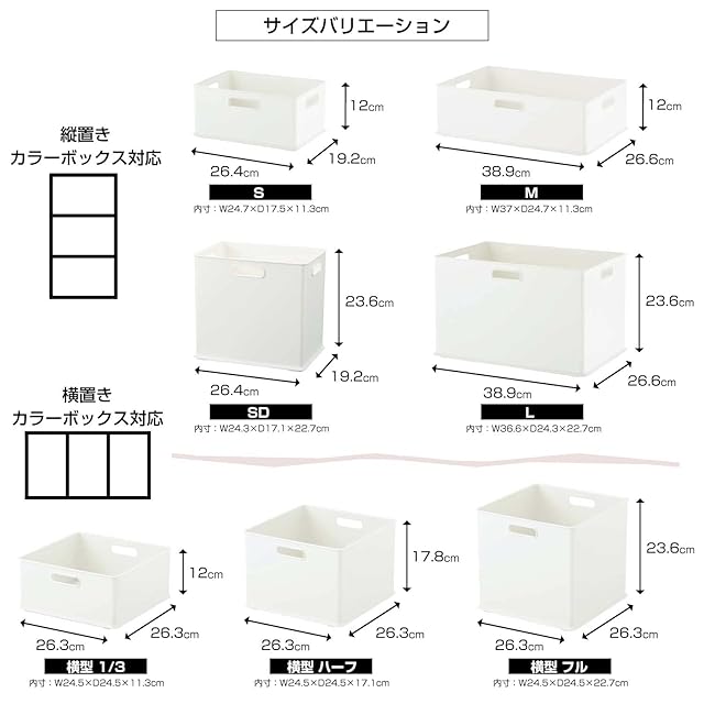 サンカ インボックス 収納ボックス 横型 1/3サイズ ホワイト (幅26.3x奥行26.3x高さ12cm) 横置きカラーボックスにぴったりフィット 3方向取っ手付き 積み重ね可能 おしゃれ 引き出し 日本製 収納ケース squ+ NIB-YSWH | HiKaRiストア