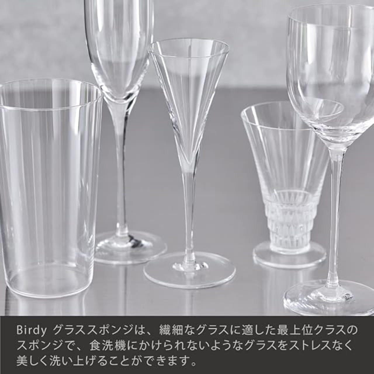 薄口のグラスや細長いフルートグラス、繊細なアンティークグラスまで、どんな形状でもストレスなく短時間ですっきり洗い上げる最上位クラスのスポンジ。