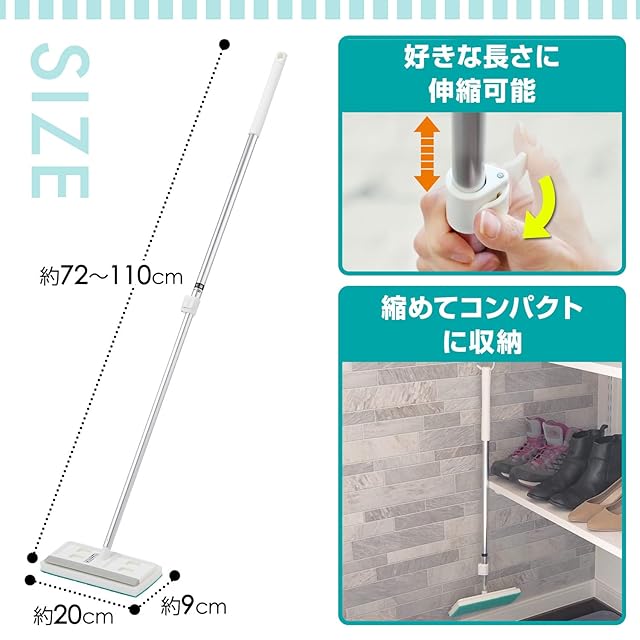 伸縮タイプ(72~110cm)なので立ったままラクラクお掃除。コンパクトに収納できます。