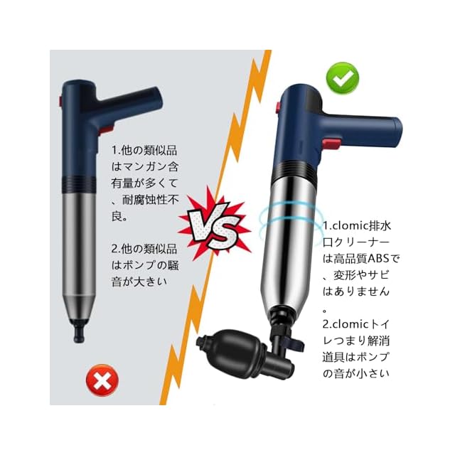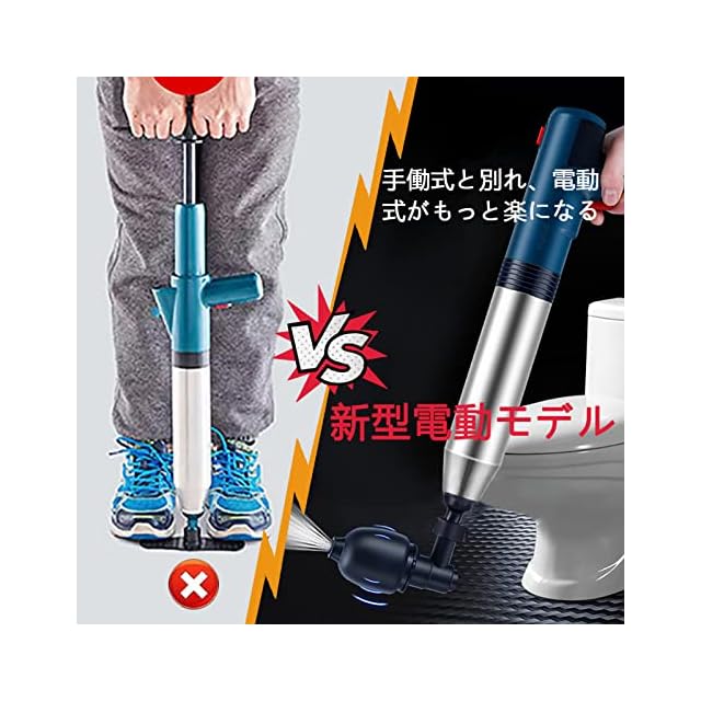 【電動式 トイレつまり解消道具】従来の手動タイプと比較して、より効率的で便利であり、お年寄りや女人でも手間をかけずに手軽にご使用いただけます。使い方は簡単です。2回ボタン押すだけ、一回目押して空気を溜めて、二回目押しつまり解消。(日本語説明書付き)