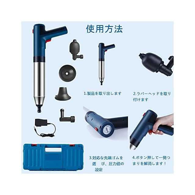 【適用範囲が広い】4つの異なるゴムヘッドが付属して、多くのタイプのパイプの诘めに適して、状況によってゴムヘッドを選ぶことができます。パイプ掃除機は、トイレ、排水口、キッチンのシンク、シャワー、床の排水口、バスタブ、トイレ 風呂、台所、洗面台の排水管?排水パイプなどに使用でき、髪の毛、布、油、その他のゴミによる詰まりを取り除くことができます。