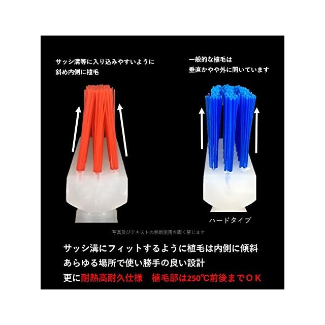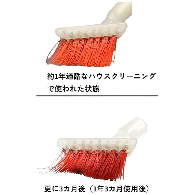 ●寸法は全て現場で作業しながら計測し、作業に無理のない形とサイズを実現しました ●熱湯でも毛先が開きません。使用限界温度120度 ●苛性ソーダや 塩酸にもしっかり耐えてくれます。 また耐摩耗性も自信があり、半年以上酷使してもブラシとしての機能は有しています。 ●握る部分の「ハンドル」は洗剤の付いた手袋で握っても滑りにくい設計。実際のハウスクリーニングの現場で使い やすさ、男性女性問わず握りやすさを徹底的に追求した形状。 ●オプションでブラシヘッドが交換可能です 材質・ハンドル・・・エラストマー ブラシヘッド・・・PP ブラシ毛・・・PBT