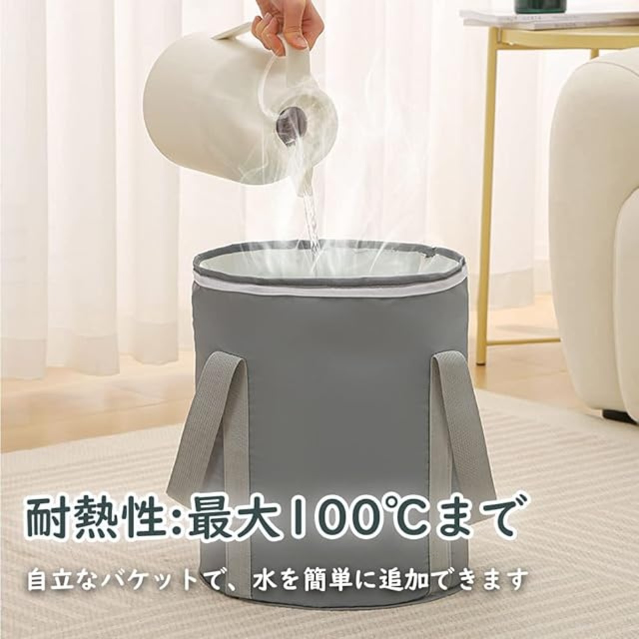 こんなお悩み、抱えていませんか?<br> ・寝つきが悪い<br> ・足がむくむ<br> ・イライラしやすい<br> そんなあなたの身体をじ~んわり温める<br> 足湯バケツがおススメです◎<br> point.01<br> 足湯に限りなく違い深さを追求<br> ふくらはぎに血液を送るポンプの役割があることは多く知られています。<br> そのふくらはぎをしっかり温められる深さがあることは、足湯を選ぶひとつのポイントになります◎<br> point.02<br> フタによる保温持続効果<br> 温度が覚めないよう、蓋付きのバケツを採用!<br> 移動時にも水ハネ防止になります。<br> フタによる保温効果<br> 室温30℃の場所で40℃のお湯をバケツに入れ、20分間フタをした結果…<br> 20分間フタをしなかった場合と比較して、お湯の温度が1.2℃も高く持続しました!<br> point.03<br> 5層構造の厚手素材を使用<br> PEVA素材…防水<br> アルミ箔<br> 発砲ポリエチレン…断熱性能<br> PU防水防湿コーティング…水に強い<br> ツイル生地…柔らかさ&伸縮性<br> コンパクト&超軽量で持ち運びも楽ちん♪<br> お出かけに便利な収納バッグ付き!<br> サッと畳んでパッと使える<br> 排水・乾燥させやすい仕組み<br> ループ付きで水が捨てやすく、<br> フックに吊るして水切り、乾燥できます◎<br> 収納方法<br> 1.底面を折りたたむ<br> 2.三つ折りにたたむ<br> 3.左右を整えて<br> 4.収納袋に入れて完成です♪<br> 足湯だけじゃない活用法<br> ・荷物の保管<br> ・エコバッグ<br> ・洗い物の一時保管<br> ・洗濯<br> ・キャンプ<br> アウトドアシーンではもちろん、災害時にも役立ちます。<br>