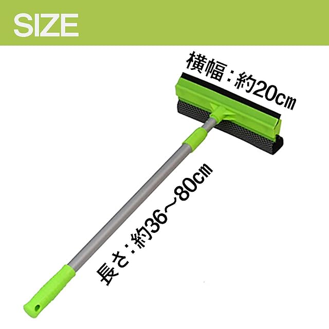 ほこりや花粉、雨などですぐに汚くなってしまう窓。面倒なガラスクリーニングも、この窓掃除クリーナーを使えばあっという間にピカピカにしてくれます。使い方はとっても簡単。軽いので女性はもちろん、お子様やご高齢の方にもおすすめです。<br><br>まず、スポンジ面に水をつけて軽く擦ります。その後スクイーパー面でさっと水を切るだけです。 雑巾や新聞紙では拭き筋が残りがちですが、これを使えば痕を残さずプロ並みの仕上がりが叶います。力も要らず、拭き掃除よりもラクチンです。<br><br>高い所もしっかり届く:ポール部分は約36㎝-80㎝までスライド伸縮しますので、高い所も隅々までキレイにする事ができます。 さらにポール部分は取り外し可能。使い終わったら、かさばらずに収納しておくことが出来ます。<br><br>コンパクトヘッドで小回り抜群:幅は約20㎝のコンパクトサイズのヘッドを採用。 小回りがきき、どなたでも扱いやすい大きさです。スリムタイプのガラス戸、お風呂や洗面所のガラス、車の窓など狭い場所の清掃にもおすすめです。<br><br>横幅:約20cm 長さ:約36-80cm 素材:メッシュスポンジ、PP(プラスチック部分)、アルミニウム(ハンドル部分) 仕様:両面 カラー:グリーン ※モニターの環境等により、色の見え方に若干差が生じる場合がございます。