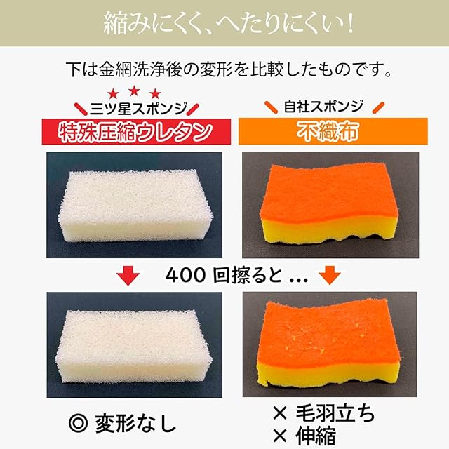 【商品概要】 泡立ち・汚れ落ち・耐久性にこだわった、三ツ星品質のスポンジ。 サイズ:幅6cm×奥行12cm×高さ3.2cm [耐熱温度]約90度 【商品説明】 【商品詳細】
