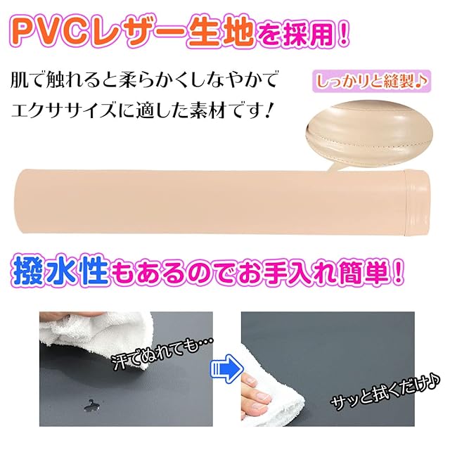 素材は肌触りの良いPVCレザーを使用しました。撥水性もあり汗で濡れても、簡単にタオルでサッと拭き取れます。中の素材は程よい硬さの反発性があるEVA素材を使用しました。耐久性も高く紫外線などの劣化もしにくい運動に適した素材です。